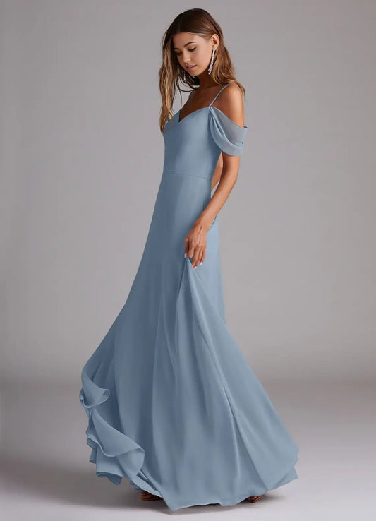 Charming A-Line Chiffon V Neck Ruffle Cold Shoulder Keyhole-Back Floor-Length Bridesmaid Dress