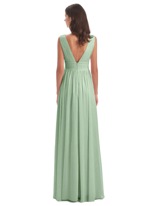 Simple A-Line V Neck Sleeveless Chiffon Pleated Floor-Length Bridesmaid Dress