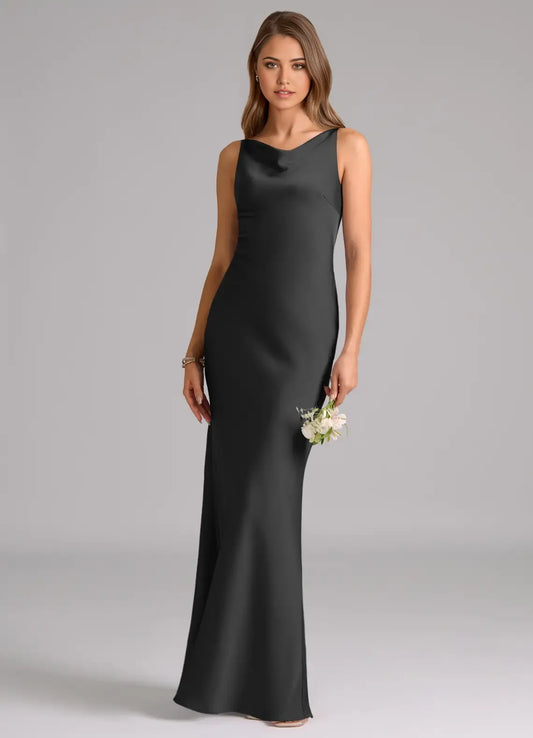 Sleek Mermaid Satin Cowl-Neck Sleeveless Zipper-Back Floor-Length Bridesmaid Dress