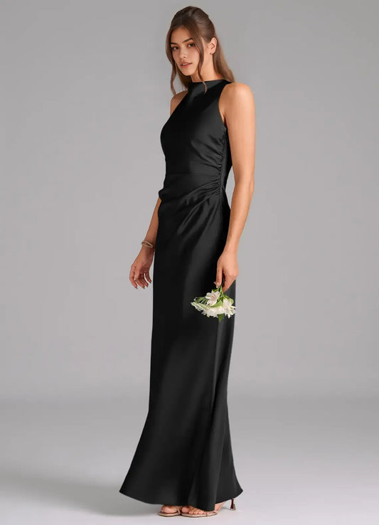 Sleek Sheath Satin High Neck Sleeveless Cross Back Floor Length Bridesmaid Dress