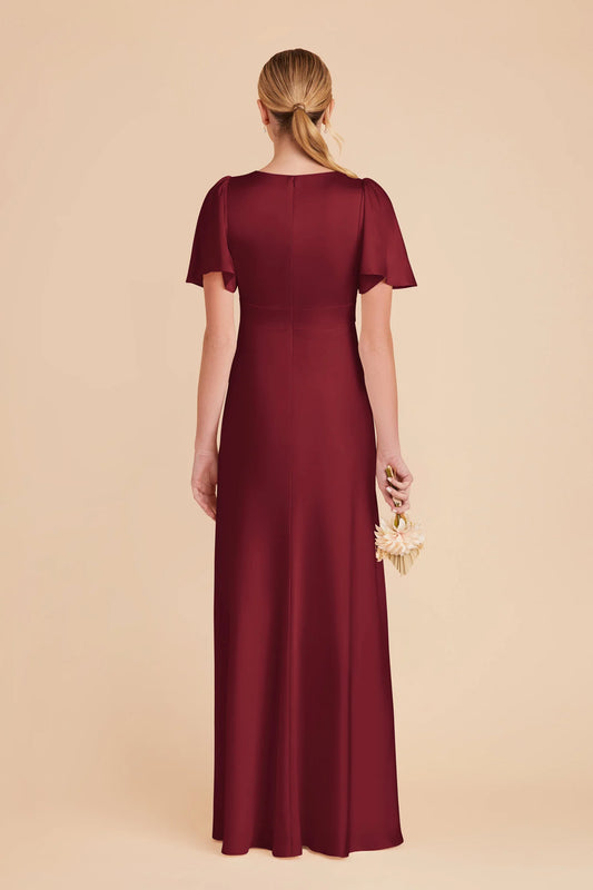Elegant Fitted Satin V Neck Flutter Sleeve Closed Back Floor Length Bridesmaid Dresses