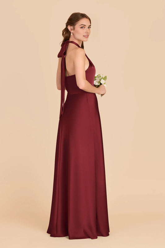 Elegant Sheath Satin Halter Neck Sleeveless Bow Back Floor Length Bridesmaid Dress