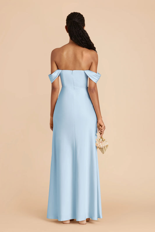 Elegant Sky Blue Sleeveless Satin Off-the-Shoulder Side Slit Floor-Length Bridesmaid Dress