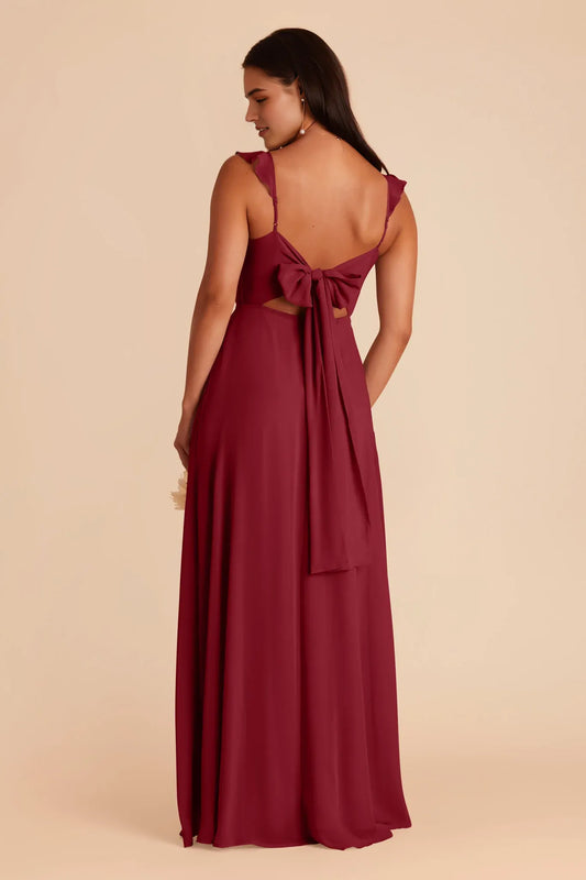 Romantic A-Line Chiffon V Neck Ruffled Strap Bow Cutout Back Floor Length Bridesmaid Dress