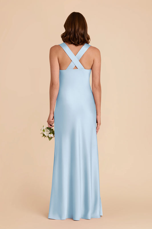 Lustrous Sky Blue Satin Crisscross Halter Mermaid Maxi Bridesmaid Dress with Open Back & Side Slit