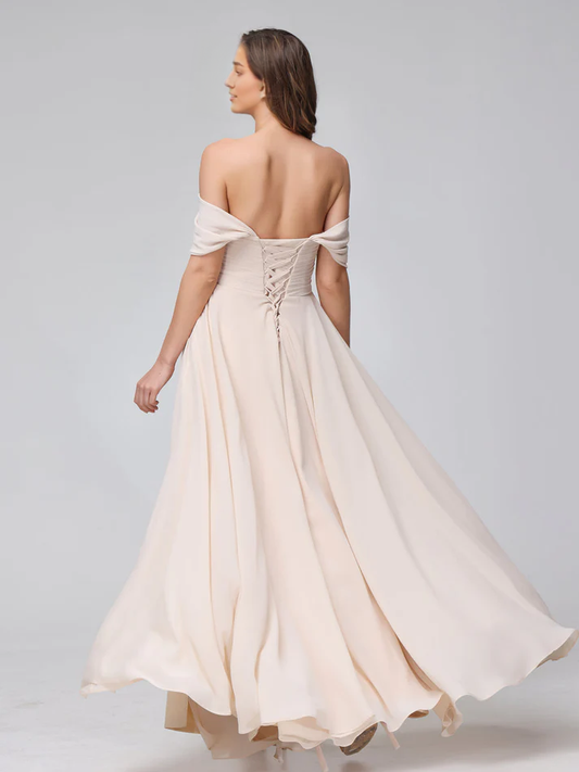 QIAIWAN Dress chiffon off shoulder pleated sleeveless bridesmaid dress