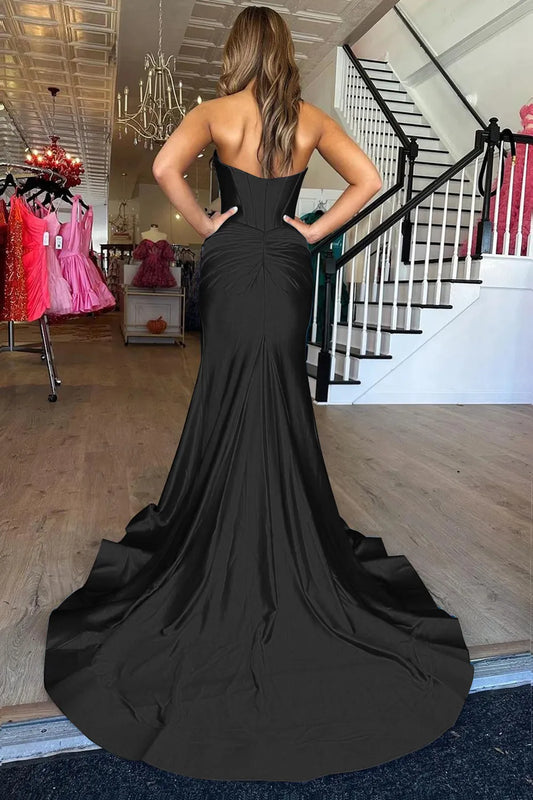 QIAIWAN mermaid satin off shoulder sleeveless slit evening gown
