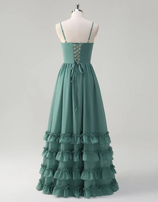 QIAIWAN Elegant Ruffle Chiffon Strap Sleeveless Ball Dress
