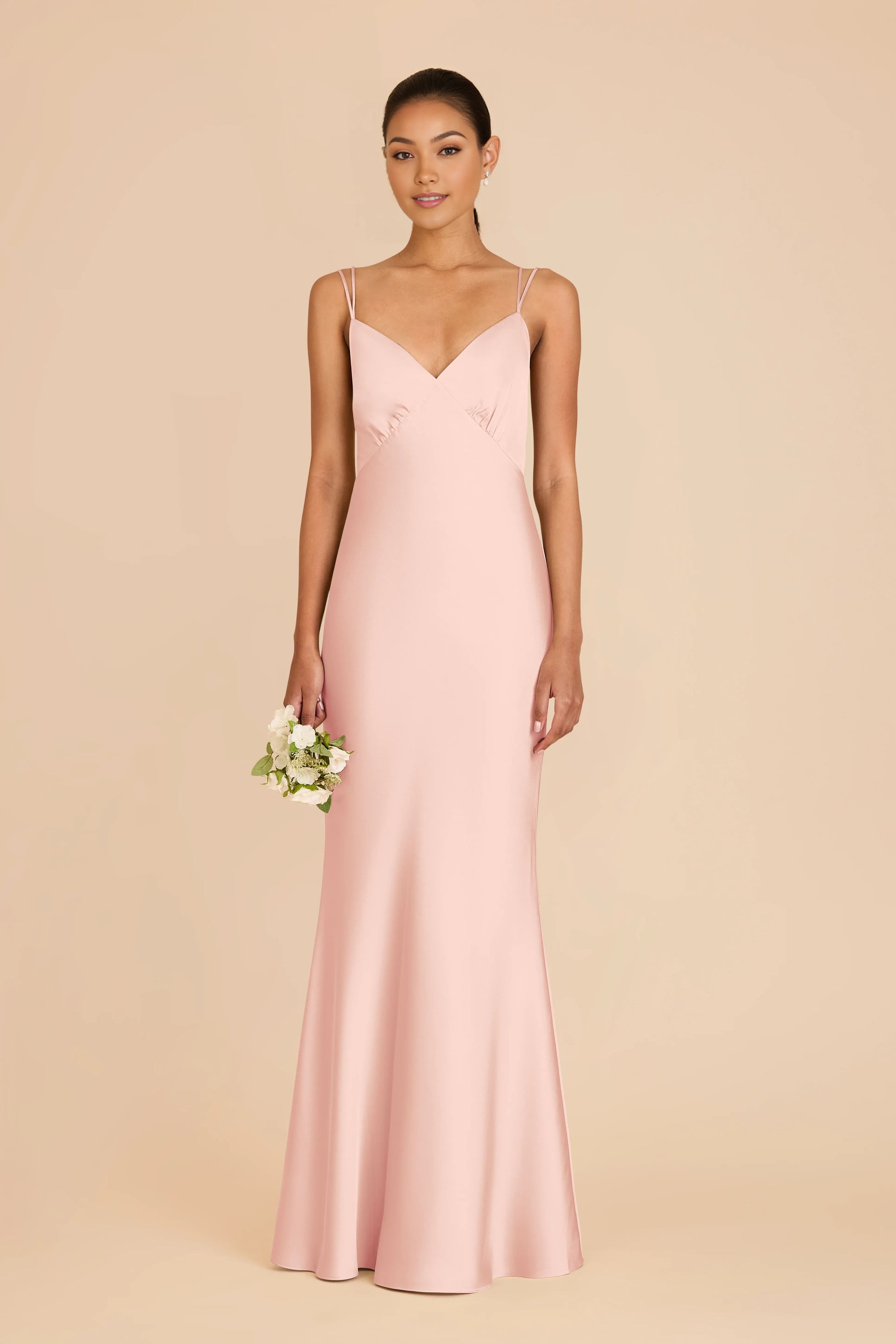 This elegant blush bridesmaid dress features a sleek mermaid silhouette crafted from luxe satin. The deep V-neck and delicate spaghetti straps add soft allure, while the crisscross-back brings modern charm. The floor-length hem drapes with a lustrous finish, hugging curves beautifully—ideal for weddings, receptions, or formal celebrations.